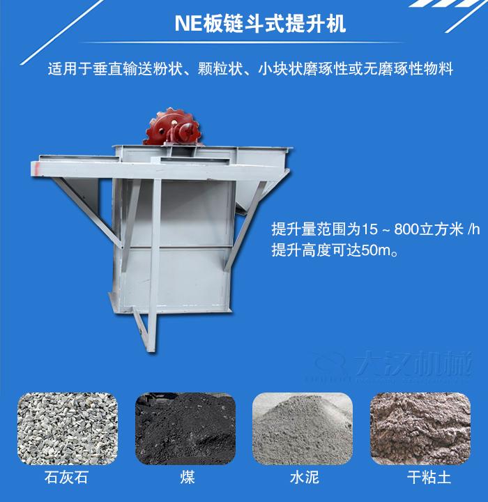 NE板鏈斗式提升機(jī)為板鏈?zhǔn)?、重力誘導(dǎo)卸料的提升設(shè)備,該系列提升機(jī)具有NE15 ~ NE800多種規(guī)格。提升量范圍為15 ~ 800m³ /h,提升高度可達(dá)50m。