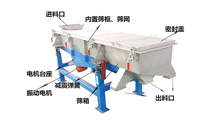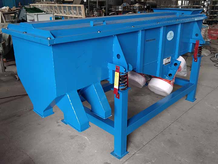 525-4P直線振動篩主要由篩箱、篩框、篩網、振動電機、電機臺座、減振彈簧、支架等組成。
